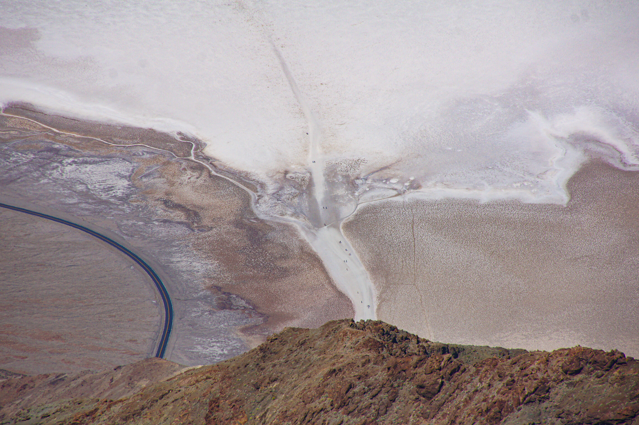 Blick von Dantes View (1669 m über NN) auf Badwater (85,5 m unter NN) und Badwater Rd.